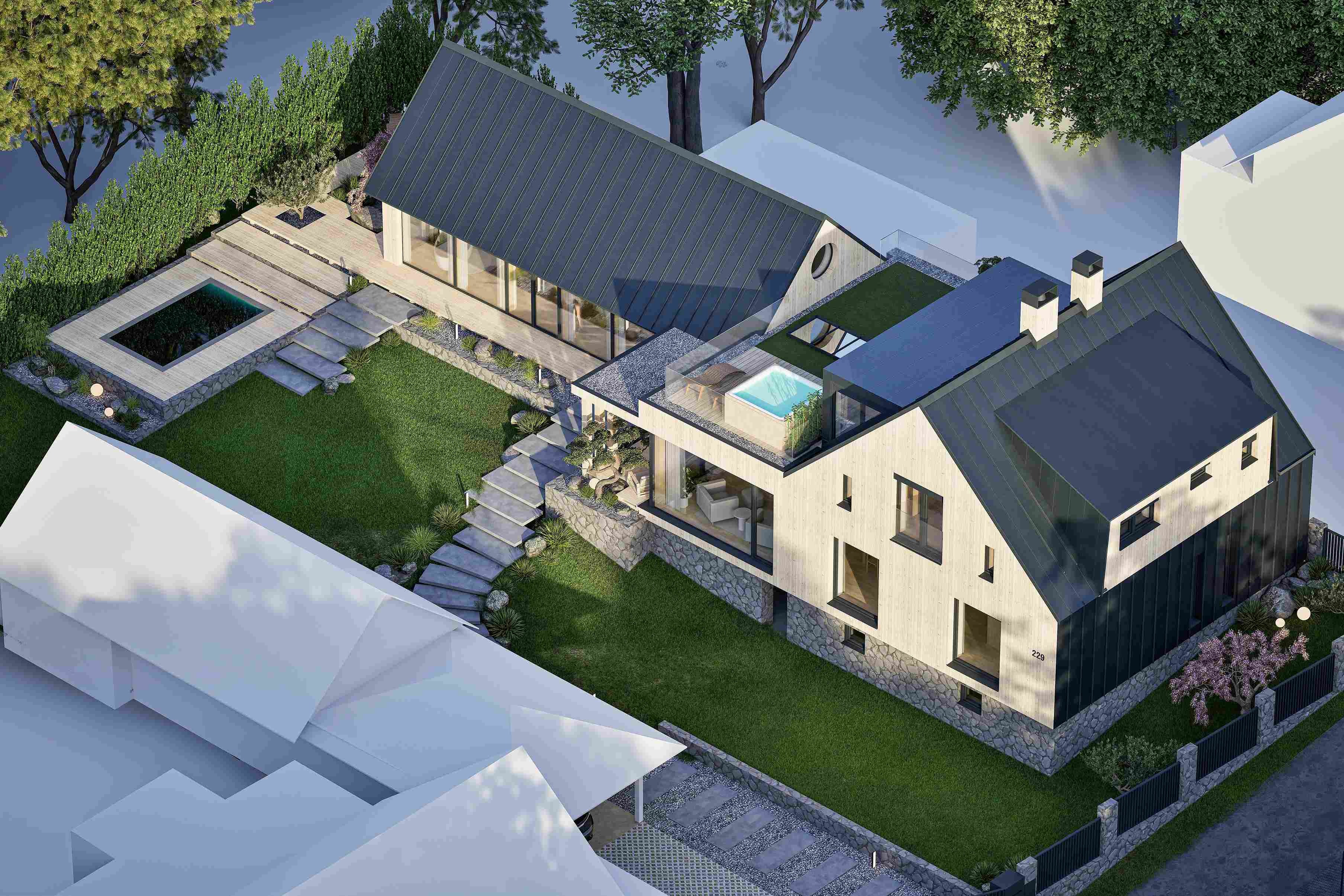 Súčasťou návrhu je aj asanácia dvoch starých budov, ktoré sa nachádzajú v riešenom území. Jedna z týchto budov bude nahradená novým objektom, ktorý bude slúžiť ako obecná knižnica a kaviareň pre širokú verejnosti. Tento nový objekt má ambíciu stať sa nielen kultúrnym centrom obce, ale aj miestom stretávania a oddychu pre všetkých obyvateľov.